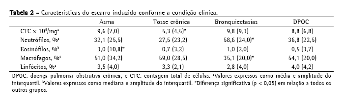 Em relação à análise da celularidade do escarro, definiu-se bronquite eosinofílica como a presença de eosinofilia no escarro ≥ 3.0%(17); bronquite eosinofílica com asma nos pacientes portadores de tosse crônica com os achados fisiológicos da asma (reversibilidade da limitação das vias aéreas e/ou hiperresponsividade) associados à eosinofilia no escarro ≥ 3.0%; bronquite eosinofílica sem asma nos pacientes portadores de tosse crônica sem os achados fisiológicos da asma (reversibilidade da limitação das vias aéreas e/ou hiperresponsividade) associados à eosinofilia no escarro ≥ 3.0%; e bronquite neutrofílica como a presença de neutrofilia no escarro (≥ 65%) associada (contagem total de células, CTC ≥ 10×106) ou não (CTC < 10×106) à infecção.(17)
