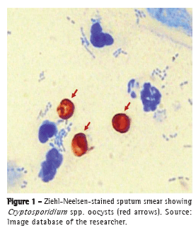Pulmonary impairment is a rare complication of intestinal cryptosporidiosis, having been reported in immunocompromised patients, most of whom have AIDS and severe immunodeficiency.(2) The prevalence of pulmonary cryptosporidiosis, however, might be underestimated, given that it is not systematically investigated.(5) In a retrospective study conducted in Spain and investigating 275 AIDS patients, 43 had enteritis caused by Cryptosporidium spp.; in 7 of those 43 patients, sputum examination identified Cryptosporidium spp. oocysts.(3)