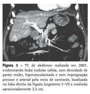 Assintomático, sem comorbidades, sem história de hepatopatia. O paciente era ex-tabagista de 30 anos-maço, abstêmio há 20 anos e negava etilismo. Exame físico de admissão sem particularidades, exceto cicatriz de toracotomia póstero-lateral esquerda. Exames laboratoriais normais, sorologias para hepatites virais negativas e alfa-fetoproteína de 3 ng/mL. No re-estadiamento, detectou-se uma lesão hepática sincrônica-2,5 cm no segmento VI (Figura 3). Tendo-se como principal hipótese a recidiva tumoral, optou-se por investigar inicialmente o fígado. Realizada biópsia percutânea, que revelou tratar-se de um carcinoma hepatocelular.