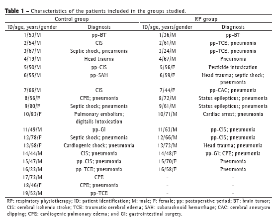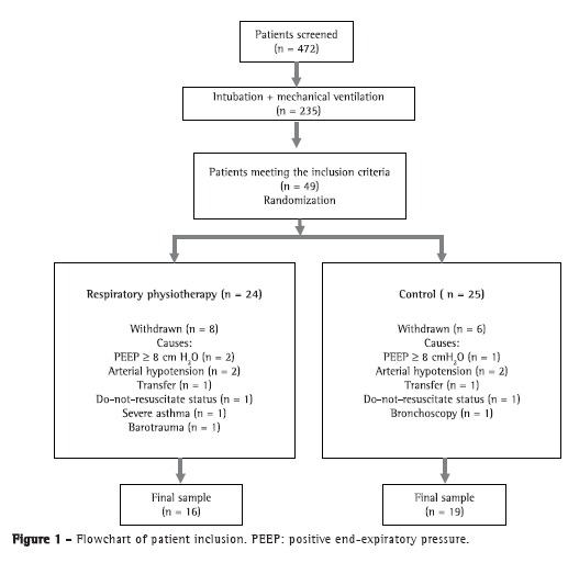 The patients were randomly assigned either to the usual treatment (control) group or to the respiratory physiotherapy (RP) group. The randomization process was performed daily for 13 consecutive months by means of a computer-generated random sequence. Allocation concealment was successful. The physicians who treated the patients had no influence on patient eligibility or allocation. The participants were analyzed in the groups to which they were randomly assigned.