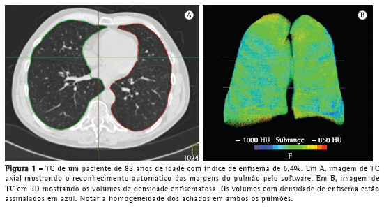 O enfisema pulmonar foi quantificado por meio de densitovolumetria pulmonar por TC, uma técnica de pós-processamento de imagem utilizada para calcular o volume de um órgão (ou parte de um órgão). A técnica emprega um conjunto completo de imagens volumétricas de TC e valores de coeficiente de atenuação (ou densidade, expressa em UH) a fim de segmentar o órgão. Além disso, a técnica é capaz de medir a CPT absoluta (que inclui ar, sangue e tecido pulmonar) e calcular o volume de uma porção do pulmão cuja densidade seja maior ou menor que o limiar selecionado. Utilizamos o software syngo InSpace 4D (Siemens Medical Systems), que automaticamente reconhece os pulmões e elimina qualquer estrutura com coeficiente de atenuação maior que −400 UH. Após a segmentação automática, o programa calcula o VPT, os volumes de enfisema e a DPM. O operador pode escolher um limiar entre pulmão normal e pulmão enfisematoso (em UH). Já foram sugeridos diversos limiares para diferenciar pulmões normais de pulmões anormais.(11-13) Com base nos parâmetros de aquisição utilizados, selecionamos um limiar de −950 UH.(11,12) O IE foi então calculado dividindo-se o VPT pelo volume pulmonar com densidade abaixo de −950 UH. O software fornece uma imagem em 3D que mostra a distribuição das áreas de enfisema (Figura 1).