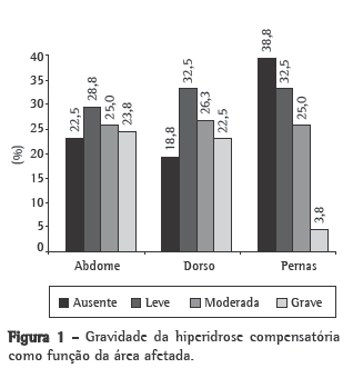A gravidade da hiperidrose compensatória dependeu da área afetada (abdome, dorso ou pernas). Dos 80 pacientes avaliados, somente 12 (15,0%) não apresentaram hiperidrose compensatória, 4 (5,0%) apresentaram hiperidrose compensatória em um ponto, e 64 (80,0%) apresentaram hiperidrose compensatória em dois ou mais pontos. Foi observada hiperidrose compensatória grave no abdome e no dorso, respectivamente, em 19 (23,8%) e 18 (22,5%) dos pacientes (Figura 1).