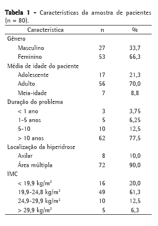 As características demográficas e pré-operatórias dos pacientes são mostradas na Tabela 1. Dos 80 pacientes incluídos na amostra, 27 (33,7%) eram do sexo masculino e 53 (66,3%) do sexo feminino. A média de idade à época da cirurgia era de 26,83 ± 10,17 anos (faixa, 12-56 anos). Coletamos dados relativos à duração do problema, área(s) afetada(s), fatores desencadeadores, índice de massa corpórea (IMC) e detalhes cirúrgicos, bem como complicações e desfechos pós-operatórios. A satisfação do paciente com os resultados foi avaliada através do uso de uma escala de classificação de 10 pontos baseada na percepção do paciente (Anexo 1).(11) O escore do grau de sudorese nas várias áreas afetadas (abdome, dorso e pernas) foi determinado no pré- e pós-operatório. Os pacientes completaram a escala sem nenhuma intervenção ou aconselhamento do entrevistador. A hiperidrose compensatória pós-operatória foi classificada como se segue: 1-4 = leve; 5-7 = moderada; e 8-10 = grave. Um escore igual a 10 indicava a área mais gravemente afetada, e os outros escores foram dados comparativamente. Finalmente, perguntou-se aos pacientes se estavam satisfeitos com o desfecho do procedimento. Os pacientes foram avaliados e completaram a escala no 13º dia de pós-operatório, no sexto mês de pós-operatório e um ano após o procedimento.