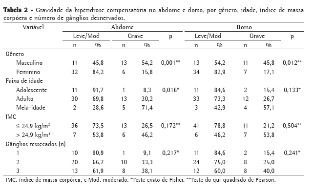 Entretanto, somente 7 (3,8%) apresentaram hiperidrose compensatória nas pernas. A gravidade da hiperidrose compensatória no abdome e no dorso foi analisada de acordo com o gênero, idade, IMC e número de gânglios desnervados (Tabela 2). Entre os 11 pacientes adolescentes que apresentaram hiperidrose compensatória, o suor abdominal foi grave em somente 1 (8,3%), comparado a 13 (30,2%) dos pacientes adultos e 5 (71,4%) dos pacientes de meia-idade (p = 0,016). Além disso, a proporção de pacientes que relataram hiperidrose compensatória no abdome foi maior entre os homens que entre as mulheres (54,2% vs. 15,8%; p = 0,001). Dos 7 pacientes com IMC > 24,9 kg/m2, 4 (53,8%) apresentaram hiperidrose compensatória no dorso, uma proporção significativamente mais alta que a observada nos pacientes com IMC ≤ 24,9 kg/m2 (p = 0,018). A proporção de pacientes que relataram hiperidrose compensatória no dorso também foi maior entre os homens que entre as mulheres (45,8% vs. 17,1%; p = 0,012).