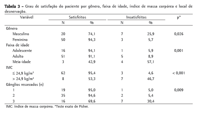 Verificou-se que 70 pacientes (87,5%) estavam satisfeitos com o desfecho da operação, ao passo que 10 pacientes (12,5%) estavam insatisfeitos. As mulheres apresentaram o mais alto nível de satisfação (p = 0,026), correspondendo a 71,4% de pacientes satisfeitos, enquanto 70,0% dos pacientes insatisfeitos eram do sexo masculino (Tabela 3). A satisfação do paciente também variou de acordo com a idade, IMC e extensão da desnervação. Dos 7 pacientes de meia-idade, 4 (57,1%) estavam insatisfeitos (p = 0,01). Dos 65 pacientes com IMC ≤ 24,9 kg/m2, 62 (95,4%) estavam satisfeitos. Por outro lado, apenas 8 (53,3%) dos 15 pacientes com IMC > 24,9 kg/m2 estavam satisfeitos (p = 0,001). Com respeito à incisão da cadeia simpática, os pacientes que foram submetidos à desnervação de 1 ou 2 gânglios apresentaram uma probabilidade significativamente maior de terem uma opinião favorável sobre o desfecho, a qual foi obtida por 95,0% e 94,6%, respectivamente, do que aqueles que foram submetidos à desnervação de 3 gânglios, sendo que somente 69,6% deles relataram estar satisfeitos (p = 0,009).