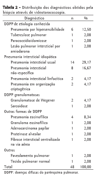 Resultados: Dos 48 pacientes incluídos no estudo, 25 (52,08%) eram do sexo feminino, e 23 (47,92%) eram do sexo masculino. A idade média foi de 58,77 anos, variando entre 20 e 76 anos. Foi realizado o exame anatomopatológico de 54 fragmentos de biópsia pulmonar: 24 (44,44%) da língula; 10 (18,52%) do lobo inferior esquerdo; 7 (12,96%) do lobo médio; 6 (11,11%) do lobo inferior direito; 5 (9,26%) do lobo superior esquerdo; e 2 (3,71%) do lobo superior direito. O tempo médio de drenagem torácica foi de 2,2 dias. Como eventos adversos, houve conversão para toracotomia em 2 pacientes (4,17%) e pneumotórax residual em 1 (2,08%). O diagnóstico definitivo foi obtido em 46 (95,83%) casos, com predomínio das pneumonias intersticiais idiopáticas (54,18%). Os diagnósticos mais frequentes foram pneumonia intersticial usual (29,27%), pneumonia intersticial não-específica (16,67%) e pneumonia por hipersensibilidade (12,50%). Conclusões: A videotoracoscopia com biópsia pulmonar é um procedimento eficaz, seguro e viável para o diagnóstico das doenças difusas do parênquima pulmonar.