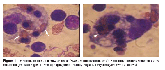 At admission, ceftriaxone, amikacin, and vancomycin were prescribed. New cultures of blood and urine specimens were negative. On postadmission day 10, the patient presented with jaundice and flapping tremor. There were no remarkable changes in the level of consciousness or in the hemodynamic parameters. Laboratory test results were considerably worse (Table 1). A HRCT scan of the chest revealed no abnormalities, and a transthoracic echocardiogram was unremarkable. Abdominal ultrasound and CT scan were normal. Serology for HIV, Epstein-Barr virus, and hepatitis was negative, as were rheumatologic markers (antinuclear antibodies, rheumatoid factor, and antineutrophil cytoplasmic antibody). Blood smear microscopy revealed leukocytosis (41,100 cells/mm3), thrombocytopenia (25,000 platelets/mm3), and anemia (hemoglobin, 7.2 g/dL; hematocrit, 21%; ferritin, 690.6 ng/dL; and serum iron, 50 mg/dL). On postadmission day 20, the patient presented with decreased urine output and developed liver failure (with hepatomegaly and splenomegaly) and respiratory failure. He was started on mechanical ventilation, hemodialysis, and vasopressors. Four blood cultures were negative. Serology for ehrlichiosis, bartonellosis, and Q fever was negative. Ferritin determination was repeated (1,619 ng/dL). A myelogram was requested because of unexplained fever, thrombocytopenia, and elevated serum ferritin, revealing red cell phagocytosis by macrophages (Figure 1). A diagnosis of hemophagocytic syndrome (HPS) was established, and the patient was started on methylprednisolone pulse therapy in the department of hematology, with no success. The patient died four days after the initiation of corticosteroid therapy.