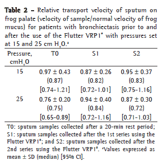 Studies have confirmed some of the mechanisms of action of this device by analyzing the volume of sputum and the spirometric parameters.(7-10) One group of authors,(4) in a pilot study of patients with bronchiectasis, evaluated the effect that two techniques, one of which being oscillating positive expiratory pressure (OPEP), have on sputum transportability and found that there was no change in transport after the use of either technique. Another group of authors,(11) in a case study of a patient with bronchiectasis, compared the effects of the use of the Flutter VRP1® and the use of "tapotement" (percussive tapping) on the transportability and viscoelasticity of sputum and concluded that the use of the device made sputum less viscous and therefore improved transportability.