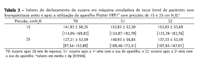 A Tabela 3 mostra os valores médios do deslocamento do escarro na máquina simuladora de tosse nos diferentes momentos e pressões expiratórias. Não houve diferenças significantes entre os momentos analisados para cada pressão e entre as pressões estudadas.