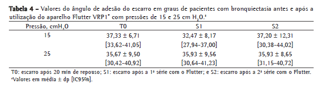 Na Tabela 4, estão apresentados os valores médios do ângulo de adesão do escarro. Observa-se que não houve diferenças significantes entre os momentos e pressões estudadas.
