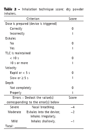 For all patients, the assessment of the use of inhalation devices was based on the scores for the use of metered dose inhalers and the scores for the use of dry powder inhalers.(17) This scoring system is based on the most common errors made by patients. If the patient follows each step correctly, the patient receives one point for each step taken; for each error made, in addition to not receiving the point, and depending on the severity of the given error, points are deducted from those already scored.