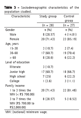 The t-test was used in order to compare the study and control groups in terms of their characteristics and in terms of compliance with pharmacological treatment. In contrast, ANOVA with repeated measures was used to compare the results obtained in the assessment of the use of inhalation devices, and the median values were considered. The tests were performed using the software SigmaStat, version 2.01 (Jandel Scientific, San Rafael, CA, USA). Values of p < 0.05 were considered significant. The results are presented as median and interquartile range (25-75%).