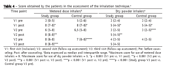 In the control group, the median scores for the use of dry powder inhalers at V1 were 3.0 and 5.0, respectively, before and after counseling and corrections (p < 0.001). The medians obtained at V2 and at V3 were 3.0 and 4.0 (p < 0.001), respectively. Therefore, the patients in the control group presented an increase in the inhalation technique scores at V1 and a slight but significant decline, with unsatisfactory scores, at V2.