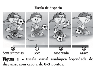 Considerou-se que os participantes tinham "asma diagnosticada" se seus pais ou responsáveis legais relatassem que a criança ou adolescente tinha diagnóstico médico de asma. De acordo com as recomendações da Global Initiative for Asthma (GINA),(12) os pacientes foram classificados como tendo asma intermitente, asma persistente leve, asma persistente moderada ou asma persistente grave.(12) Os pacientes estavam em tratamento regular de acordo com as recomendações da GINA para cada forma de apresentação da doença: um β2-agonista, prescrito conforme a necessidade, para pacientes com asma intermitente; doses baixas de um corticosteroide inalatório para aqueles com asma persistente leve; a combinação de um β2-agonista de longa duração e doses baixas de um corticosteróide inalatório para aqueles com asma persistente moderada; e a combinação de um β2-agonista de longa duração e doses altas de um corticosteróide inalatório, com ou sem um esteróide, para aqueles com asma persistente grave. Todos os pacientes foram orientados quanto ao preenchimento de um diário de sintomas e da escala de dispneia descrita abaixo. A asma foi considerada controlada quando o paciente tinha sintomas diurnos ≤ 2 vezes por semana, não tinha nenhum sintoma/despertar noturno, tinha necessidade de medicação de resgate ≤ 2 vezes por semana, não tinha nenhuma limitação das atividades de vida diária e não havia tido nenhuma exacerbação no último mês.(12) Um teste de BIE foi definido como positivo se houvesse uma queda do VEF1 ≥ 10% em relação ao valor basal.(13)
