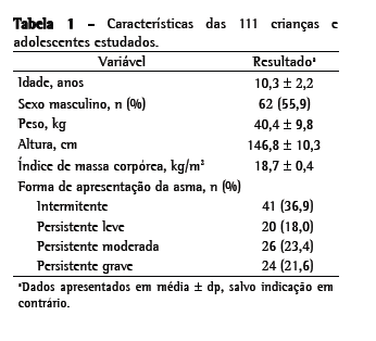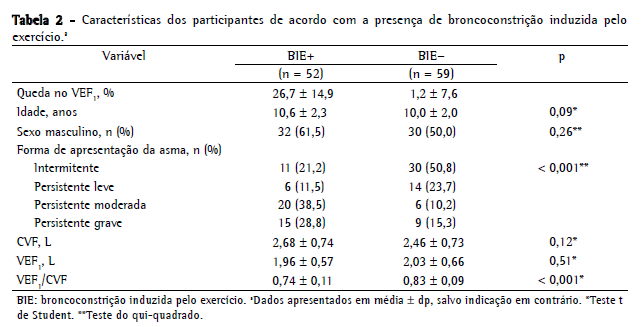 ResultadosDos 134 participantes elegíveis, 23 foram excluídos: 14 em razão de dados incompletos, 4 em razão de não conseguirem completar o teste de exercício de seis minutos e 5 em razão de não preencherem os critérios técnicos. Portanto, 111 pacientes completaram o estudo. Dentre eles, 52 (47%) apresentaram resultado positivo no teste de BIE. A média de idade dos participantes foi de 10,3 ± 2,2 anos, e a maioria era do sexo masculino. A maior parte tinha asma persistente moderada ou asma persistente grave (Tabela 1). Nenhum realizava atividade física regularmente.
