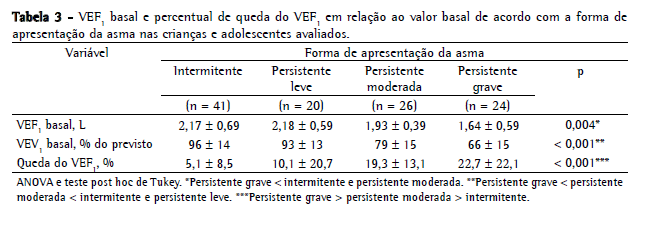 Observou-se uma associação inversa significativa entre a forma de apresentação da dispneia e o VEF1, em L e em percentual do previsto. O percentual de queda do VEF1 em relação ao valor basal foi significativamente maior entre os pacientes com asma persistente grave ou asma persistente moderada do que entre os com outras formas de apresentação (p < 0,001; Tabela 3).