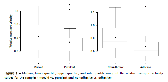 Figure 1 compares the mucoid and purulent samples, as well as the nonadhesive and adhesive samples, in terms of the RTV.