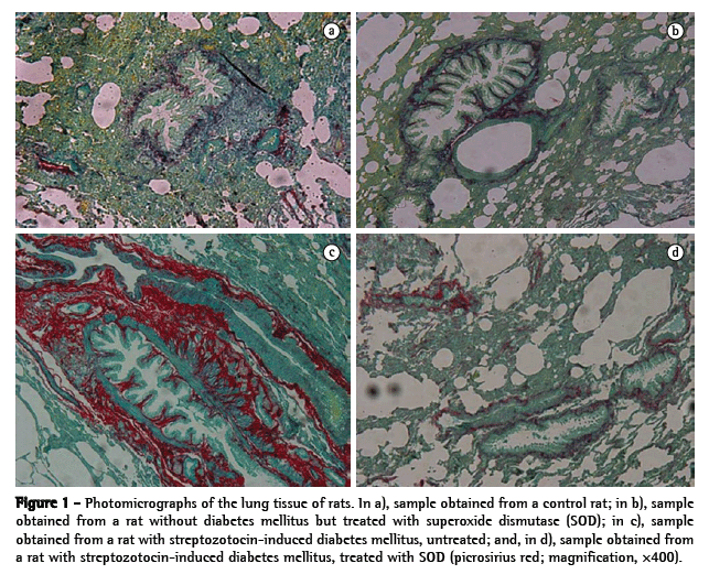 However, after the administration of SOD, lipid peroxidation decreased, and, consequently, the lung tissue of rats with streptozotocin-induced DM showed increased SOD activity after treatment. This beneficial effect of the use of the exogenous antioxidant was described in a previous study evaluating the antioxidant effect of α-lipoic acid on oxidative stress and on the expression of inducible nitric oxide synthase in streptozotocin-induced diabetic rats.(26)