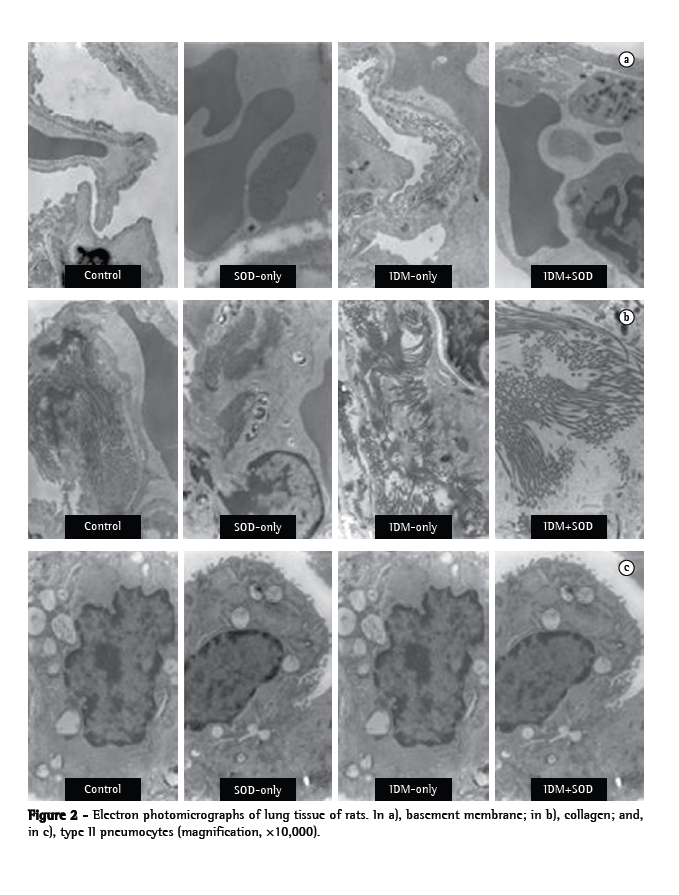 In our study, we found that pulmonary oxidative stress was significantly greater in the rats with streptozotocin-induced DM than in the control animals. The rats with streptozotocin-induced DM showed greater lipid peroxidation, higher levels of glycemia, and less SOD activity. In those same rats, we observed alterations in the lung ultrastructure, as evidenced by the increased thickness of the basement membrane, together with pulmonary fibrosis and alterations in type II pneumocytes. We believe that those alterations are interrelated, because they were reduced after the administration of SOD. These results support the hypothesis that the oxidative stress seen in DM can cause alterations in the lung structure and that, after the administration of exogenous SOD, these parameters are restored to their basal conditions.