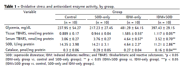 In the present study, the administration of SOD had no effect on plasma glucose levels, a finding that corroborates the results of another study, in which the use of mimetic SOD was evaluated in an experimental model of diabetes in rats.(24)