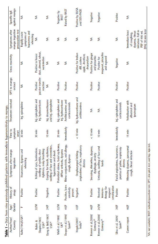 6. Hegde VL, Venkatesh YP. Anaphylaxis following ingestion of mango fruit. J Investig Allergol Clin Immunol. 2007;17(5):341-4.