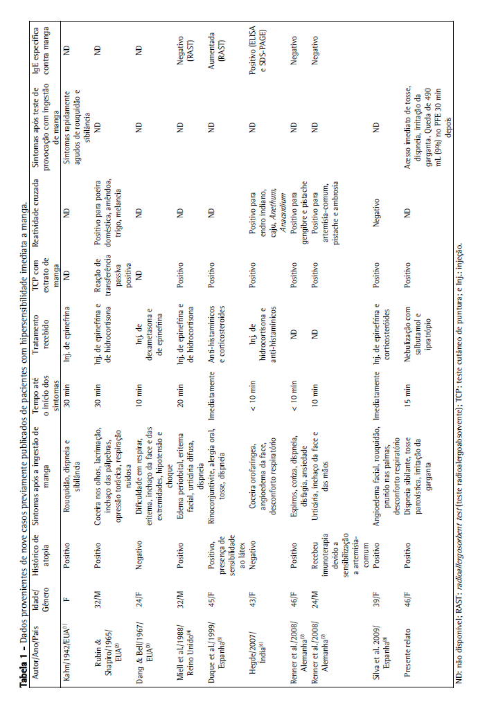 Dos nove pacientes nos quais foram relatadas reações de hipersensibilidade imediata a manga (Tabela 1), três apresentaram eritema,(3,4,7) cinco apresentaram angioedema,(2,4,6-8) oito apresentaram desconforto respiratório/dispneia(1-8) e dois apresentaram anafilaxia,(2,3) que em um deles evoluiu para choque anafilático com risco de morte.(2) Informações sobre o teste cutâneo de alergia a manga estavam disponíveis para sete dos nove pacientes, e o resultado havia sido positivo nos sete.(2,4,5,6-8) A IgE específica para manga foi avaliada em seis pacientes,(4-9) porém apenas três apresentaram resultado positivo.(5,6,8) É possível que anticorpos IgE específicos contra o antígeno da manga não sejam aparentes em alguns pacientes, pois os alérgenos correspondentes podem ser instáveis e não ser detectados. O sistema de detecção de IgE atualmente disponível parece carecer de alguns alérgenos específicos da manga, e ainda não há um padrão de referência para o diagnóstico de sensibilização do tipo I a manga.