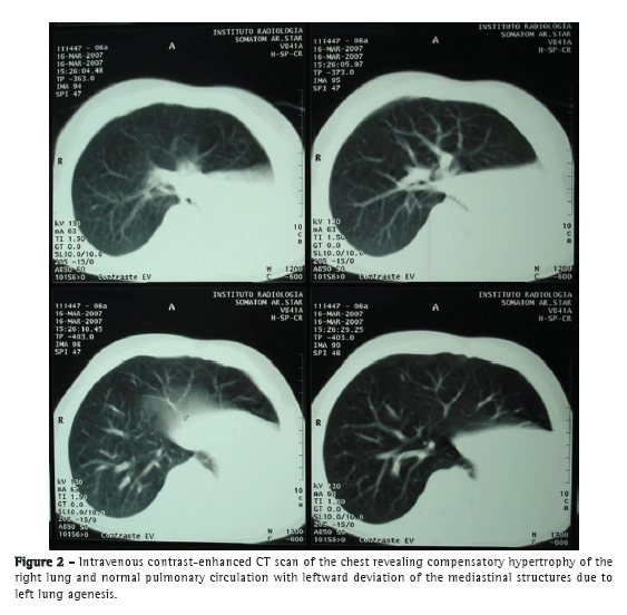 Case reportAn 8-year-old White male patient from the city of Jaguarão, Brazil, sought medical attention. He had been born at term, and there had been no complications during pregnancy. He had a family history of asthma. Since early 2006, when he was 7 years old, the patient had been having attacks of wheezing, having been treated at home by his family. When he sought medical attention in February of 2007, the patient presented with a dry cough that progressed to wheezing and dyspnea for one month. He was hospitalized in his hometown. A chest X-ray performed at admission showed opacity of the left hemithorax, which was treated as bacterial pneumonia (Figure 1). Physical examination by a pulmonologist revealed that the patient was active, acyanotic, and breathing normally; pulmonary auscultation revealed retraction of the left hemithorax, dullness to percussion, and absent breath sounds on the left with wheezing on the right; cardiac auscultation revealed normal, rhythmic heart sounds without heart murmurs. The following tests were requested: chest HRCT; bronchoscopy; Doppler echocardiography; and abdominal ultrasound. Chest HRCT showed left lung agenesis, compensatory hypertrophy of the right lung, and normal right pulmonary circulation with leftward deviation of the mediastinal structures. There were no changes in upper abdominal structures (Figure 2). Abdominal ultrasound and echocardiography showed normal findings. Bronchoscopy revealed a blind-ending left main bronchus. Two months later, the patient returned for a follow-up evaluation. He presented with clinical signs of wheezing and was treated with a β2 agonist, which provided symptom relief. Chest X-ray findings remained consistent with left lung agenesis. Spirometry revealed moderate obstructive lung disease, with no significant variation in flow or volume after bronchodilator use. Pre-bronchodilator values were as follows: FVC = 1.19 L (106% of predicted); FEV1 = 0.60 L/s (56% of predicted); and FEV1/FVC ratio = 0.50 (55% of predicted). Post-bronchodilator values were as follows: FVC = 1.21 L (108% of predicted); FEV1 = 0.61 L/s (57% of predicted); and FEV1/FVC ratio = 0.51 (56% of predicted). Follow-up echocardiography, performed in 2008 and 2009, revealed right ventricular enlargement (right ventricular diameter = 29 mm; reference value = 7-18 mm) with normal pulmonary flow and no communications, shunts, or intracardiac obstructions.