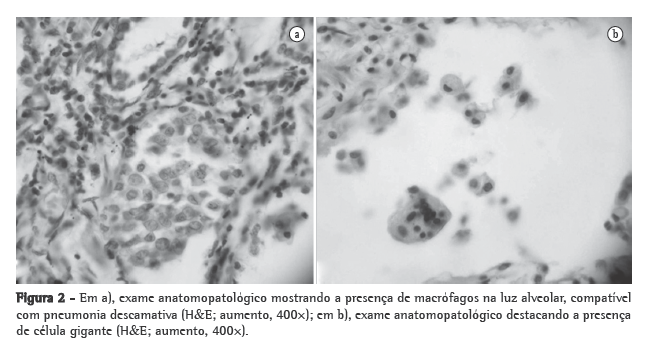 DiscussãoEm 1968, Liebow desenvolveu a classificação histológica original para as pneumonias intersticiais crônicas, classificando-as em pneumonia intersticial usual, pneumonia intersticial descamativa, pneumonia intersticial linfoide, bronquiolite obliterante com pneumonia intersticial e pneumonia intersticial por células gigantes.(1) Estudos sugerem que a maioria dos casos de pneumonia intersticial por células gigantes é causada pela exposição aos componentes da liga de metal duro, tendo sido excluída da classificação de pneumonia intersticial idiopática proposta pela American Thoracic Society/European Respiratory Society, e o termo "doença pulmonar por metal duro" é preferido para designá-la atualmente.(1-3)