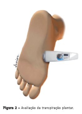 Os pacientes foram submetidos à mensuração da sudorese nas palmas de suas mãos e plantas dos pés através do aparelho. Este é um instrumento portátil, não invasivo, que possui uma câmara de aferição fechada que elimina a interferência externa de correntes de ar (ar condicionado, respiração e abertura e fechamento de portas e janelas), permitindo uma medida precisa da perda de água transepidérmica. Dentro da câmara estão os sensores de umidade relativa e de temperatura. Durante as medições, o instrumento foi posicionado perpendicularmente sobre a pele, permanecendo em contato com a superfície cutânea até que sinalizasse o término da operação de leitura. A taxa de evaporação foi calculada automaticamente pelo instrumento a partir da elevação da umidade relativa do ar dentro da câmara fechada do dispositivo. A medida relaciona o aumento da massa de água (em g) pela área de evaporação (em m2) por unidade de tempo (em h), ou seja, a unidade de medida é g/m2/h.