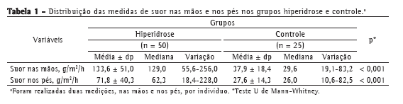 ResultadosA quantificação da intensidade de transpiração palmar e plantar dos pacientes e dos controles está representada na Tabela 1. Os valores médios da intensidade de transpiração de pacientes com hiperidrose palmoplantar foram de 133,6 ± 51,0 g/m2/h nas mãos e de 71,8 ±40,3 g/m2/h nos pés. No grupo controle, os resultados foram, respectivamente, 37,9 ±18,4 g/m2/h e 27,6 ± 14,3 g/m2/h.