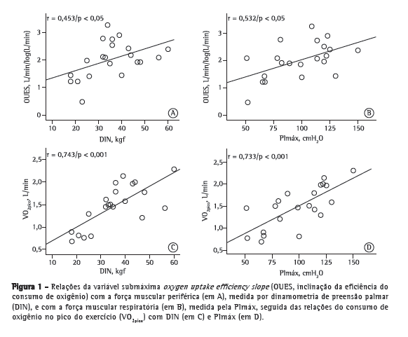 A OUES depende do desenvolvimento de acidose metabólica, da massa muscular, da extração e utilização de oxigênio e do espaço morto fisiológico pulmonar, que é afetado pela perfusão pulmonar e sua integridade estrutural.(8) Embora tenha sido sugerido que a relação entre força muscular e OUES dependa da massa muscular, tal relação, até onde pudemos averiguar, nunca foi estudada.
