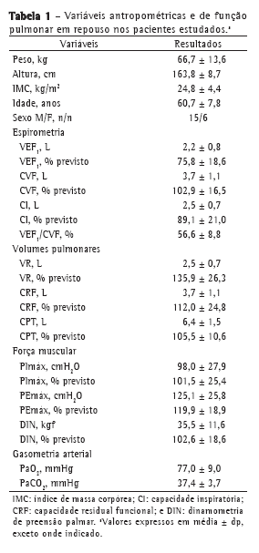 Os resultados das variáveis antropométricas, de espirometria, volumes pulmonares, força muscular e gasometria da população estudada são mostrados na Tabela 1. A amostra envolveu 21 pacientes (15 homens) com média de idade de 60,7 ± 7,8 anos. Os volumes pulmonares e a força muscular periférica e respiratória (ambos em % do previsto) se mostraram dentro dos limites previstos de normalidade, assim como PaO2 e PaCO2 em repouso.