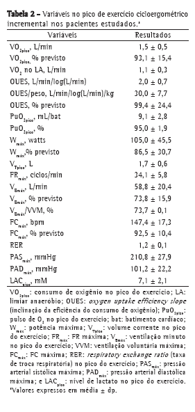 Para realizar o TECP, utilizamos os critérios e protocolos indicados em diretrizes nacionais.(13) O teste foi realizado em um sistema metabólico (Oxycon Delta system; Jaeger, Würzburg, Alemanha) com câmara de mistura para ergoespirometria proporcional. O sistema, conectado a um programa (OxyconLAB; Jaeger) e a uma bicicleta ergométrica (ER 900; ergoline GmbH., Bitz, Alemanha), com frenagem eletromagnética, tinha carga e protocolo gerados no programa referido. A calibragem era feita antes de cada exame, conforme protocolos do fabricante, e a calibragem biológica era realizada a cada três meses. O VO2pico foi considerado como a média dos últimos 15 s no pico do exercício e foi estipulado como a máxima tolerância, limitada por sintomas, a falta de ar não suportável ou fadiga nas pernas que impedissem a pedalagem a uma ciclagem > 50 ciclos/min. A ventilação voluntária máxima (VVM) foi estimada pelo produto VEF1 × 37,5.(15) O limiar anaeróbio (LA) foi determinado conforme o método V-slope.(19) O protocolo de teste tipo incremental em rampa foi individualizado, baseado na fórmula de Wasserman para incremento da carga e baseada no consumo máximo de oxigênio (VO2máx) previsto,(20) sendo o valor previsto baseado nos valores nacionais de Neder et al.(21) A dosagem do lactato baseou-se em fotometria de reflexão de lactato (660 nm) em sangue da ponta do dedo, mensurado em um sistema portátil (Accutrend Lactate; Roche, Mannhein, Alemanha).