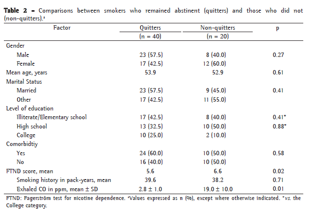 We evaluated 60 patients enrolled in the smoking cessation program of a tertiary-referral cardiothoracic hospital in the city of Fortaleza, Brazil. The study period was from August of 2006 to August of 2007.