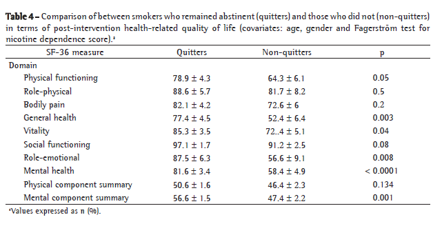 After adjusting for age, gender and FTND score, we found that the quitters presented higher post-intervention scores than did the non-quitters for the general health, vitality, role-emotional and mental health domains, as well as for the mental component summary (p = 0.001 for all; Table 4).