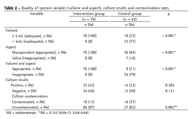 Patients in the intervention and control groups were similar in terms of gender, age and the duration of TB treatment prior to sputum sample collection (Table 1). In the intervention group, 100% of the sputum samples were classified as adequate in volume (≥ 5 mL), compared with only 23% of the control group samples (Table 2). In terms of the aspect of the sputum samples, 100% and 83% of the intervention and control group samples, respectively, were classified as mucopurulent (p < 0.05). The TB positivity rate, as determined by direct sputum smear microscopy to detect acid-fast bacilli, was similar in the intervention and control groups: 4% and 7%, respectively (p = 0.47). Culture contamination was identified in 10 (13%) of the 76 intervention group samples, compared with 16 (37%) of the 43 control group samples (p = 0.002; OR = 0.25; 95% CI: 0.09-0.69).