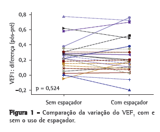 O presente estudo mostrou que não houve diferença na variação do VEF1 após a administração de 400 µg de salbutamol por ID, com e sem espaçador, na prova broncodilatadora da espirometria.
