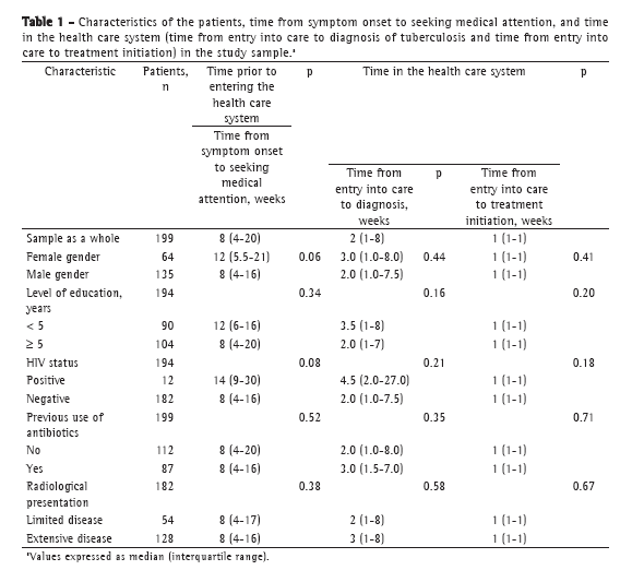 Other variables analyzed were gender, age, level of education, previous use of antibiotics, HIV status, site of first medical visit (primary health care clinic or emergency room), and radiological extent of tuberculosis. The medians and 25-75% interquartile ranges (IQRs) of the variables were calculated, and the Kruskal-Wallis and Mann-Whitney tests were used in order to compare the groups in terms of the medians. Multiple linear regression analysis, which was adjusted for potential confounding variables, was used for identifying associations between independent and dependent variables. Results were considered significant when p < 0.05.
