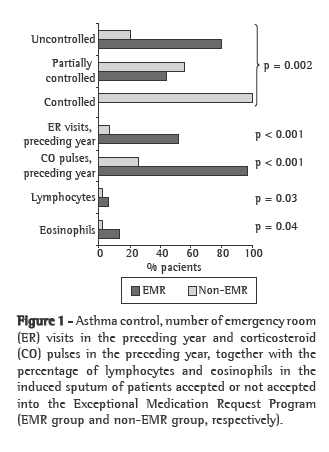 DiscussionThe criteria for patient acceptance into the EMR program, outlined in Complementary Directive SAS/MS 12, issued on 12 November, 2002,(4,10) were appropriate for the identification of the patients presenting the greatest disease severity. Those criteria stratified patients based on the frequency at which they used health care resources. The patients selected to receive medication from the EMR presented a higher number of emergency room visits in the preceding year, a higher number of exacerbations and a more frequent need for corticosteroid pulses. It is known that patients with severe asthma who achieve control of the disease visit the emergency room less frequently and are less likely to receive oral corticosteroid pulses, although these severity markers present no significant association with corticosteroid dependency.(17)