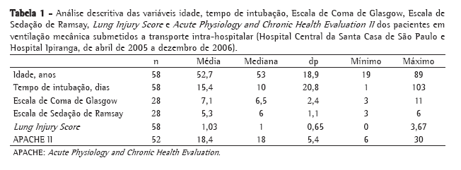 Foram incluídos 48 pacientes, num total de 58 transportes, sendo 30 dentro do Hospital Central da Santa Casa de São Paulo e 28 dentro do Hospital Ipiranga. Entretanto, nem todas as variáveis foram consideradas nos 58 transportes, pois, em alguns casos, estes dados não constavam da ficha de coleta de dados; em outros casos, os dados tiveram que ser retirados da análise: por exemplo, os resultados de gasometria tiveram um número reduzido (n = 46), pois alguns não eram arteriais e, neste caso, eram desprezados.
