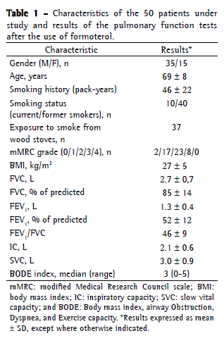 The general and functional data of the patients are shown in Table 1. The values of FEV1 and FEV1% after formoterol use were higher than those obtained through the spirometry performed up to 1 year before the inclusion of the patients in the present study.