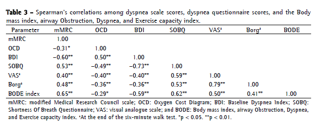 The correlation matrix between the BODE index, the dyspnea scale scores, and the dyspnea questionnaire scores is shown in Table 3.