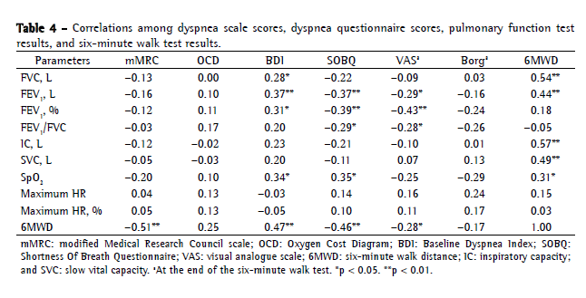 Objective: To determine the correlations among various dyspnea scales, spirometric data, exercise tolerance data, and the Body mass index, airway Obstruction, Dyspnea, and Exercise capacity (BODE) index in patients with COPD. Methods: Between March of 2008 and July of 2009, 79 patients with COPD were recruited, and 50 of those patients were included in the study. After being regularly treated with formoterol for one month, the patients completed the modified Medical Research Council (mMRC, dyspnea scale), Baseline Dyspnea Index (BDI), Oxygen Cost Diagram (OCD), and Shortness Of Breath Questionnaire (SOBQ). Subsequently, the patients underwent spirometry and six-minute walk tests (6MWTs), with determination of the six-minute walk distance (6MWD), as well as initial and final SpO2. All patients also completed the Visual Analogue Scale (VAS) and the Borg scale. Results: The best correlations were between the Borg scale and the VAS (rs = 0.79) and between the BDI and the SOBQ (rs = −0.73). Among the one-dimensional scales (the VAS, mMRC, OCD, and Borg scale), only the VAS correlated with the spirometric parameters, whereas the multidimensional scales BDI and SOBQ did correlate, but poorly. The MRC, BDI, and SOBQ correlated well with 6MWD. Among the spirometric data, inspiratory capacity (IC) and FVC had the strongest correlations with 6MWD. In the multivariate analysis, BDI and IC were selected as the best predictors of 6MWD. Conclusions: Multidimensional dyspnea scales should be applied in the evaluation of COPD patients.