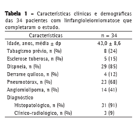 No total, 41 pacientes iniciaram o tratamento com 100 mg/dia de doxiciclina. A média de idade das pacientes era de 41 ± 9 anos, enquanto a dos controles era 40 ± 4 anos. Nenhuma era fumante atual, sendo que 10 (24%) eram ex-tabagistas, e 27 (66%) haviam apresentado pneumotórax previamente. O diagnóstico de LAM foi estabelecido por estudo histopatológico em 37 (93%), sendo por biópsia pulmonar em 35 e por biópsia de outro sítio em 2. O diagnóstico clínico-radiológico, definido pela associação da presença de angiomiolipomas renais e cistos pulmonares, foi realizado em 4 pacientes.
