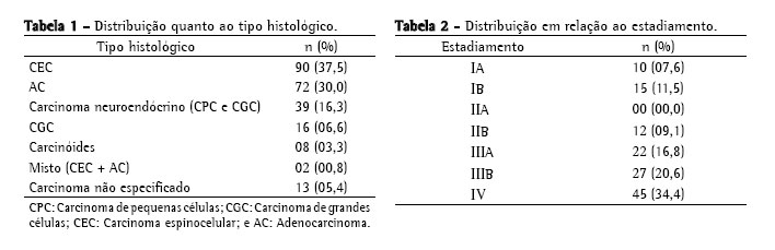 ResultadosDe janeiro de 2000 a janeiro de 2006, foram acompanhados 240 pacientes com câncer de pulmão, sendo 64% do sexo masculino. Estes foram seguidos até janeiro de 2007, quando foi encerrado este trabalho. Foram perdidos no acompanhamento 4,2% dos pacientes por não se conseguir contato telefônico. Entre os homens, a média de idade foi 64 anos e, entre as mulheres, 59 anos, e 77 (32%) estavam acima de 70 anos. O tabagismo foi evidenciado em 89,4% dos casos avaliados, com carga tabágica média de 47,02 anos-maço. Entre os homens, a prevalência de tabagismo foi de 97,36%, com carga tabágica média de 52,25 anos-maço. Entre as mulheres, os valores foram de 72,97% e 33,64 anos-maço. O padrão histológico de maior incidência foi o carcinoma espinocelular, seguido pelo adenocarcinoma (Tabela 1).