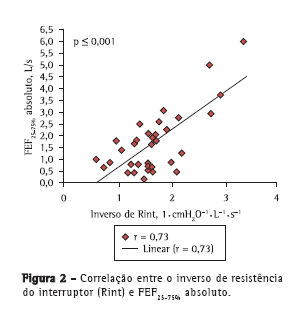 Em nossa amostra, encontramos valores de Rint discretamente aumentados se comparados com dados de referência locais.(3) No presente estudo, analisamos as correlações entre os principais parâmetros espirométricos e Rint. Também propusemos um ponto de corte de Rint para determinar a resposta ao broncodilatador e o comparamos com dados bem fundamentados a respeito da variação do VEF1. Encontramos correlação significativa entre Rint e VEF1 absoluto. Além disso, a correlação entre o inverso de Rint e VEF1 mostrou-se ainda mais forte, o que se deve provavelmente ao fato de ambos serem dependentes do fluxo. No entanto, após a normalização dos dados, não encontramos correlação significativa entre os dois, o que sugere que Rint e VEF1 refletem diferentes aspectos da função pulmonar.