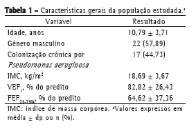 Entre março de 2008 e agosto de 2009, 38 pacientes foram avaliados. A média de idade dos pacientes estudados foi de 10,79 anos, com predominância do sexo masculino (57,89%). A média de VEF1, em porcentagem do previsto (VEF1%), foi de 82,82%, indicando comprometimento leve da função pulmonar; a mediana do escore Z para Rint foi de 0,29 (II: −0,32 a 0,93), indicando Rint levemente aumentada (Tabelas 1 e 2).