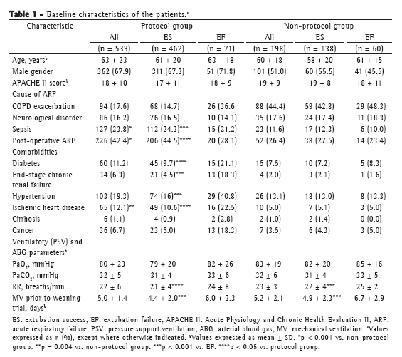 A previous trial(29) showed that non-invasive MV facilitated early extubation and improved the outcome in selected patients. In our study, non-invasive MV was used in the protocol group (in accordance with the weaning protocol) and in the non-protocol group (depending on the decision of the attending physician). Non-invasive MV was more commonly used in the non-protocol group, especially in the patients with COPD. However, it was not the purpose of the present study to assess the use of non-invasive MV during the weaning process.