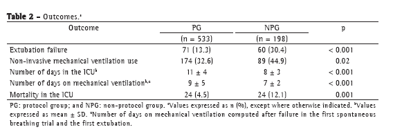 The strengths of the present study are the large number of patients recruited and its multicenter nature, whereas the major limitation is the study design. This was not a study on weaning; the focus was on extubation in patients in whom the SBT was successful. We did not randomly assign the weaning method. Therefore, the decision to use the protocol or not might have correlated with unmeasured outcomes. The lack of blinding might have introduced an allocation bias, meaning that the attending physicians were more reluctant to allocate COPD patients to the protocol group, although this might have been compensated by the higher number of septic patients in that group. In the non-protocol group, the criteria for tolerance to the T-piece trial and for ventilatory support were determined by the attending physician, whereas, in the protocol group, the strict criteria adopted minimized the subjectivity of the medical decisions.