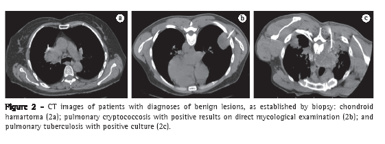 Of the 17 cases confirmed as benign, only 3 (17.6%) were specifically diagnosed by fine-needle aspiration biopsy (Figure 2): as hamartoma (in 1); as pulmonary cryptococcosis (in 1 HIV-positive patient); and as pulmonary tuberculosis (positive culture for Mycobacterium tuberculosis) with associated silicosis (in 1 patient). In 11 (64.7%) of those 17 cases, the cytological findings were not specific, the diagnosis being confirmed by clinical follow-up/imaging tests in 4 and by surgical biopsy in 7. For the patients undergoing clinical follow-up, appointments and CT scans of the chest were regularly made available for a minimum period of 3 years, during which time there were no changes in the clinical profiles or X-ray findings. Among the patients undergoing surgical biopsy, the final diagnoses were as follows: pulmonary tuberculosis (in 3); pulmonary fibrosis (in 2); pulmonary cyst (in 1); and tissue fibrosis from previous surgery, with suspicion of recurrent cancer (in 1).